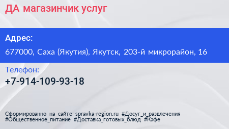 ДА, магазинчик услуг по адресу 677000, Саха (Якутия), Якутск, 203-й микрорайон, 16 в дальнейшем Организация, размещена в следующих категориях: