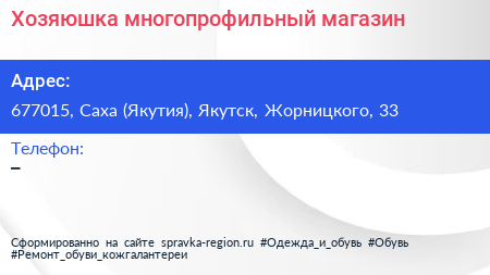Хозяюшка, многопрофильный магазин по адресу 677015, Саха (Якутия), Якутск, Жорницкого, 33 в дальнейшем Организация, размещена в следующих категориях: