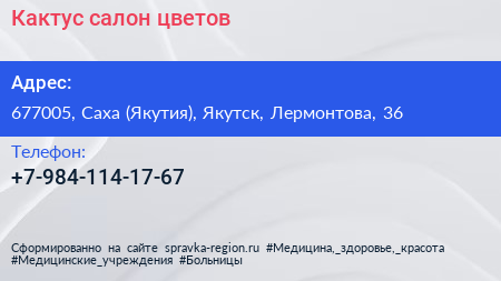 Кактус, салон цветов по адресу 677005, Саха (Якутия), Якутск, Лермонтова, 36 в дальнейшем Организация, размещена в следующих категориях: