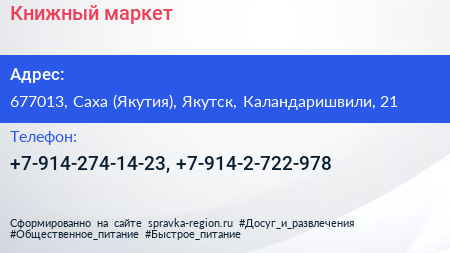 Книжный маркет по адресу 677013, Саха (Якутия), Якутск, Каландаришвили, 21 в дальнейшем Организация, размещена в следующих категориях: