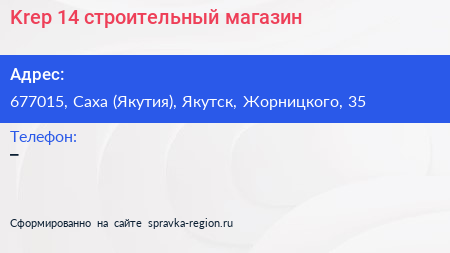 Krep-14, строительный магазин по адресу 677015, Саха (Якутия), Якутск, Жорницкого, 35 в дальнейшем Организация, размещена в следующих категориях:
