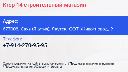 Krep-14, строительный магазин по адресу 677008, Саха (Якутия), Якутск, СОТ Животновод, 9 в дальнейшем Организация, размещена в следующих категориях: