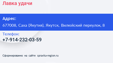 Лавка удачи по адресу 677008, Саха (Якутия), Якутск, Вилюйский переулок, 8 в дальнейшем Организация, размещена в следующих категориях: