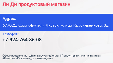 Ли Ди, продуктовый магазин по адресу 677021, Саха (Якутия), Якутск, улица Красильникова, 3д в дальнейшем Организация, размещена в следующих категориях: