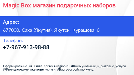 Magic Box, магазин подарочных наборов по адресу 677000, Саха (Якутия), Якутск, Курашова, 6 в дальнейшем Организация, размещена в следующих категориях:
