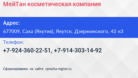 МейТан, косметическая компания по адресу 677009, Саха (Якутия), Якутск, Дзержинского, 42 к3 в дальнейшем Организация, размещена в следующих категориях: