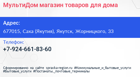 МультиДом, магазин товаров для дома по адресу 677015, Саха (Якутия), Якутск, Жорницкого, 33 в дальнейшем Организация, размещена в следующих категориях: