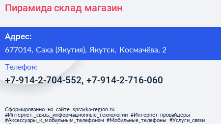 Пирамида, склад-магазин по адресу 677014, Саха (Якутия), Якутск, Космачёва, 2 в дальнейшем Организация, размещена в следующих категориях:
