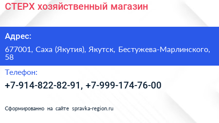 СТЕРХ, хозяйственный магазин по адресу 677001, Саха (Якутия), Якутск, Бестужева-Марлинского, 58 в дальнейшем Организация, размещена в следующих категориях: