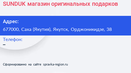 SUNDUK, магазин оригинальных подарков по адресу 677000, Саха (Якутия), Якутск, Орджоникидзе, 38 в дальнейшем Организация, размещена в следующих категориях: