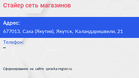 Стайер, сеть магазинов по адресу 677013, Саха (Якутия), Якутск, Каландаришвили, 21 в дальнейшем Организация, размещена в следующих категориях: