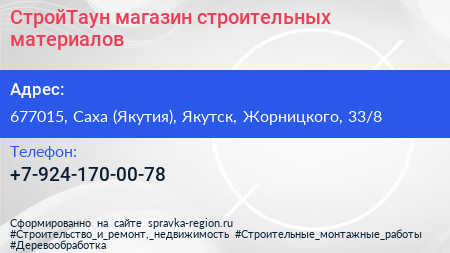 СтройТаун, магазин строительных материалов по адресу 677015, Саха (Якутия), Якутск, Жорницкого, 33/8 в дальнейшем Организация, размещена в следующих категориях: