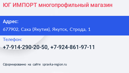 ЮГ-ИМПОРТ, многопрофильный магазин по адресу 677902, Саха (Якутия), Якутск, Строда, 1 в дальнейшем Организация, размещена в следующих категориях: