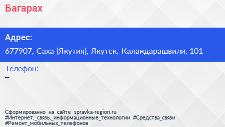 Багарах по адресу 677907, Саха (Якутия), Якутск, Каландарашвили, 101 в дальнейшем Организация, размещена в следующих категориях: