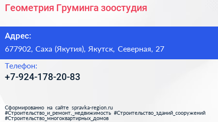 Геометрия Груминга, зоостудия по адресу 677902, Саха (Якутия), Якутск, Северная, 27 в дальнейшем Организация, размещена в следующих категориях: