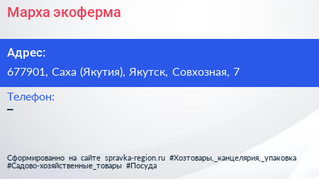 Марха, экоферма по адресу 677901, Саха (Якутия), Якутск, Совхозная, 7 в дальнейшем Организация, размещена в следующих категориях: