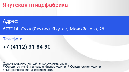 Якутская птицефабрика по адресу 677014, Саха (Якутия), Якутск, Можайского, 29 в дальнейшем Организация, размещена в следующих категориях: