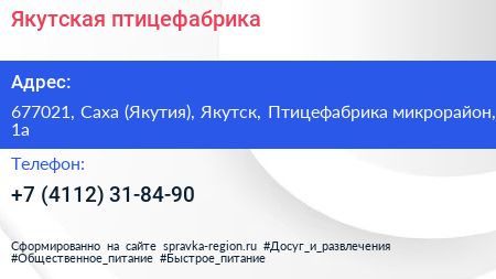 Якутская птицефабрика по адресу 677021, Саха (Якутия), Якутск, Птицефабрика микрорайон, 1а в дальнейшем Организация, размещена в следующих категориях: