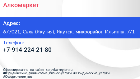 Алкомаркет по адресу 677021, Саха (Якутия), Якутск, микрорайон Ильинка, 7/1 в дальнейшем Организация, размещена в следующих категориях: