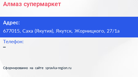 Алмаз, супермаркет по адресу 677015, Саха (Якутия), Якутск, Жорницкого, 27/1а в дальнейшем Организация, размещена в следующих категориях: