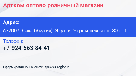 Артком, оптово-розничный магазин по адресу 677007, Саха (Якутия), Якутск, Чернышевского, 80 ст1 в дальнейшем Организация, размещена в следующих категориях: