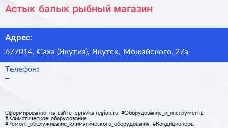 Астык балык, рыбный магазин по адресу 677014, Саха (Якутия), Якутск, Можайского, 27а в дальнейшем Организация, размещена в следующих категориях: