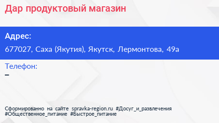 Дар, продуктовый магазин по адресу 677027, Саха (Якутия), Якутск, Лермонтова, 49а в дальнейшем Организация, размещена в следующих категориях:
