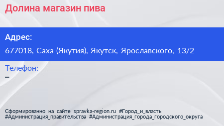 Долина, магазин пива по адресу 677018, Саха (Якутия), Якутск, Ярославского, 13/2 в дальнейшем Организация, размещена в следующих категориях: