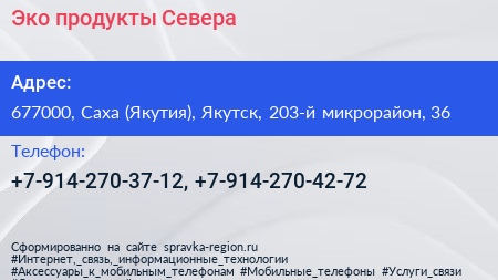 Эко продукты Севера по адресу 677000, Саха (Якутия), Якутск, 203-й микрорайон, 36 в дальнейшем Организация, размещена в следующих категориях: