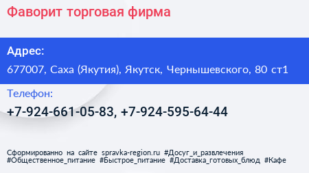 Фаворит, торговая фирма по адресу 677007, Саха (Якутия), Якутск, Чернышевского, 80 ст1 в дальнейшем Организация, размещена в следующих категориях: