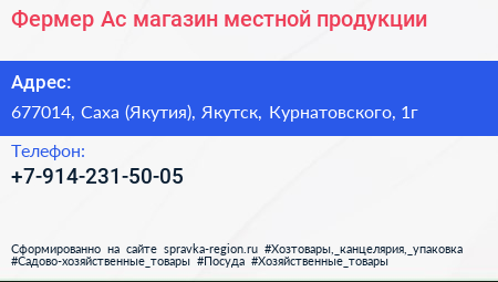 Фермер-Ас, магазин местной продукции по адресу 677014, Саха (Якутия), Якутск, Курнатовского, 1г в дальнейшем Организация, размещена в следующих категориях: