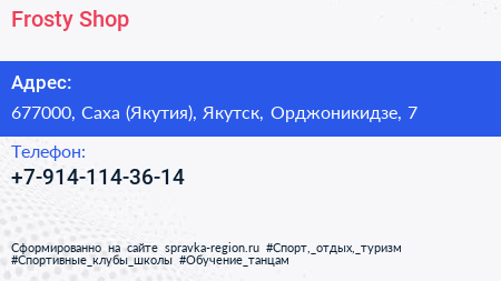 Frosty Shop по адресу 677000, Саха (Якутия), Якутск, Орджоникидзе, 7 в дальнейшем Организация, размещена в следующих категориях: