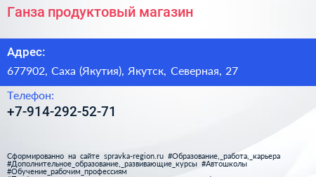 Ганза, продуктовый магазин по адресу 677902, Саха (Якутия), Якутск, Северная, 27 в дальнейшем Организация, размещена в следующих категориях: