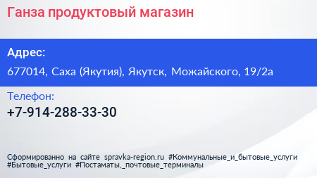 Ганза, продуктовый магазин по адресу 677014, Саха (Якутия), Якутск, Можайского, 19/2а в дальнейшем Организация, размещена в следующих категориях: