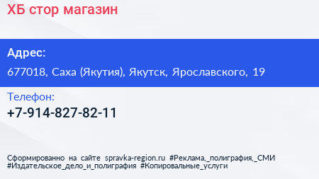 ХБ стор, магазин по адресу 677018, Саха (Якутия), Якутск, Ярославского, 19 в дальнейшем Организация, размещена в следующих категориях: