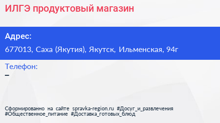 ИЛГЭ, продуктовый магазин по адресу 677013, Саха (Якутия), Якутск, Ильменская, 94г в дальнейшем Организация, размещена в следующих категориях: