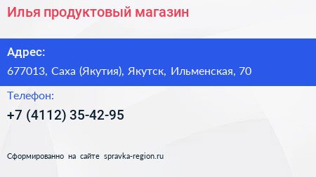 Илья, продуктовый магазин по адресу 677013, Саха (Якутия), Якутск, Ильменская, 70 в дальнейшем Организация, размещена в следующих категориях: