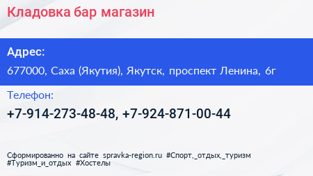 Кладовка, бар-магазин по адресу 677000, Саха (Якутия), Якутск, проспект Ленина, 6г в дальнейшем Организация, размещена в следующих категориях: