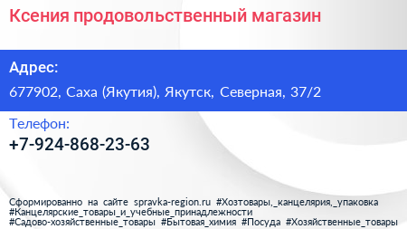 Ксения, продовольственный магазин по адресу 677902, Саха (Якутия), Якутск, Северная, 37/2 в дальнейшем Организация, размещена в следующих категориях: