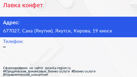 Лавка конфет по адресу 677027, Саха (Якутия), Якутск, Кирова, 19 киоск в дальнейшем Организация, размещена в следующих категориях: