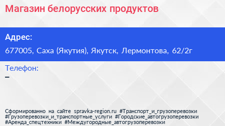 Магазин белорусских продуктов по адресу 677005, Саха (Якутия), Якутск, Лермонтова, 62/2г в дальнейшем Организация, размещена в следующих категориях: