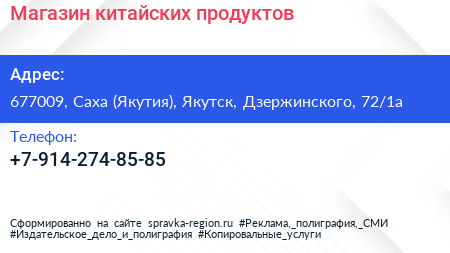 Магазин китайских продуктов по адресу 677009, Саха (Якутия), Якутск, Дзержинского, 72/1а в дальнейшем Организация, размещена в следующих категориях: