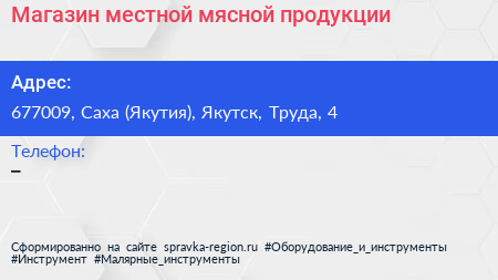 Магазин местной мясной продукции по адресу 677009, Саха (Якутия), Якутск, Труда, 4 в дальнейшем Организация, размещена в следующих категориях: