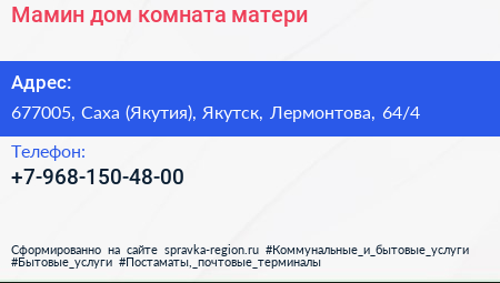 Мамин дом, комната матери по адресу 677005, Саха (Якутия), Якутск, Лермонтова, 64/4 в дальнейшем Организация, размещена в следующих категориях: