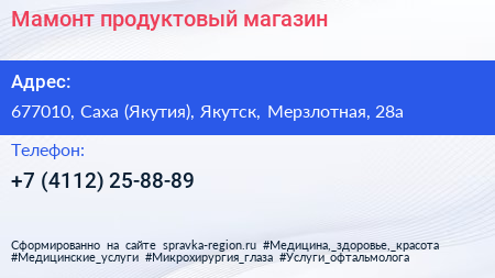 Мамонт, продуктовый магазин по адресу 677010, Саха (Якутия), Якутск, Мерзлотная, 28а в дальнейшем Организация, размещена в следующих категориях: