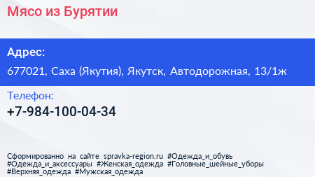 Мясо из Бурятии по адресу 677021, Саха (Якутия), Якутск, Автодорожная, 13/1ж в дальнейшем Организация, размещена в следующих категориях: