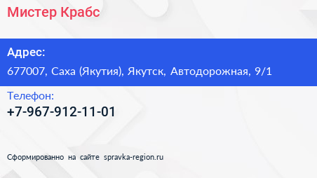 Мистер Крабс по адресу 677007, Саха (Якутия), Якутск, Автодорожная, 9/1 в дальнейшем Организация, размещена в следующих категориях: