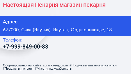 Настоящая Пекарня, магазин-пекарня по адресу 677000, Саха (Якутия), Якутск, Орджоникидзе, 18 в дальнейшем Организация, размещена в следующих категориях: