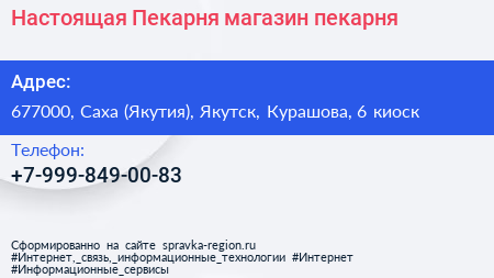 Настоящая Пекарня, магазин-пекарня по адресу 677000, Саха (Якутия), Якутск, Курашова, 6 киоск в дальнейшем Организация, размещена в следующих категориях: