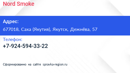 Nord Smoke по адресу 677018, Саха (Якутия), Якутск, Дежнёва, 57 в дальнейшем Организация, размещена в следующих категориях:
